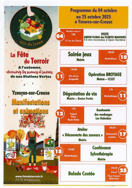 : 0247945501 Du 04/10/2025 au 25/10/2025 Découvrez le programme de la Fête du Terroir sur notre commune d'Yzeures-sur-Creuse ! Jeux, randonnée, dégustation, visite, ... il y en a pour tous les goûts !