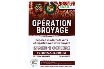 Opération broyage Le 11 Octobre 2025 La Communauté de communes Loches Sud Touraine à Yzeures sur creuse le samedi 11 octobre à partir de 14h pour une prestation de broyage sur le site de la Baignade. Information importante à savoir : Diamètre 10 cm max Apport sans pierre ni ferraille Bambou interdit (trop fibreux…).